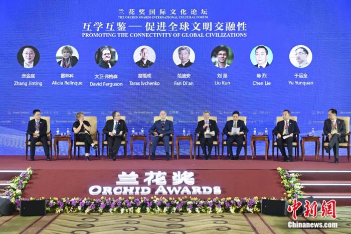 2023年9月8日,首届兰花奖国际文化论坛在北京举行,大卫·弗格森(左三)就全球文明交融性发言。田雨昊 摄
