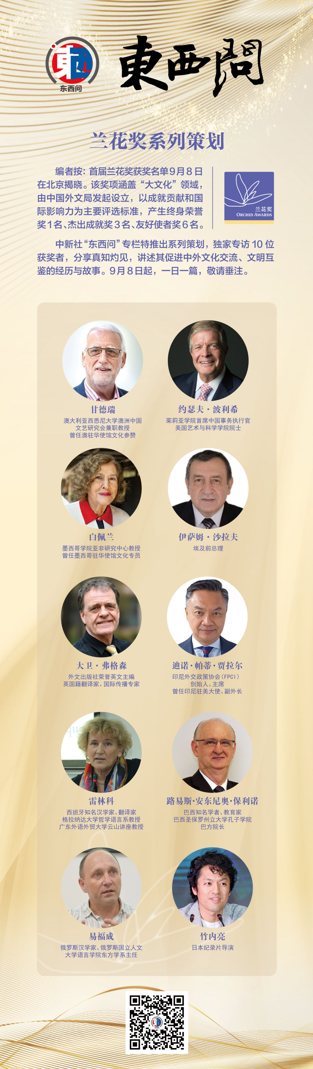 中新社“东西问”专栏特推出系列策划,独家专访10位获奖者,分享真知灼见,讲述其促进中外文化交流、文明互鉴的经历与故事。9月8日起,一日一篇,敬请垂注。