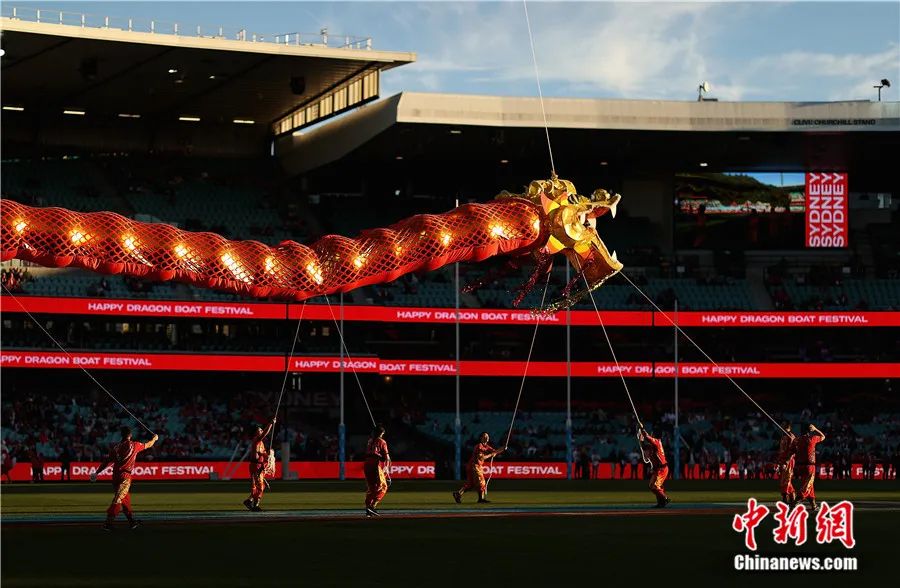 在澳大利亚悉尼板球中心举行的澳大利亚澳式橄榄球比赛开始前,场地中央上演了极具中国传统特色的飞龙表演。顾时宏 摄