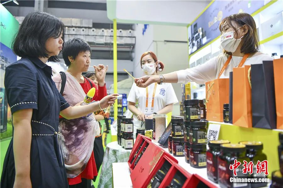 在海南海口举办的第三届中国国际消费品博览会上,观众品尝产自澳大利亚的蜂蜜。骆云飞 摄