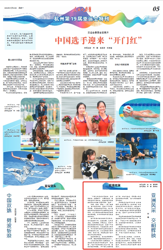 亚洲各国山海相连、人文相亲,亚洲人民和平、团结、包容,而亚运会正是以体育促和平、促团结、促包容的最好平台。随着各项赛事陆续展开,精彩动人的亚洲故事一定会更多。(刘峣)