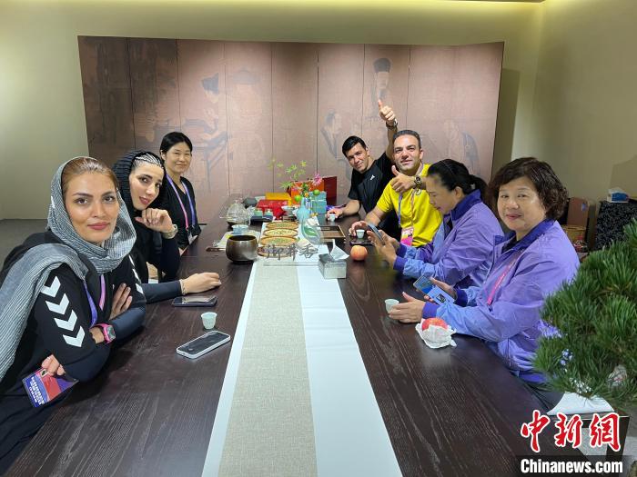 9月25日,来自伊朗的技术官员品杭州桂花龙井。 张淑娜 摄