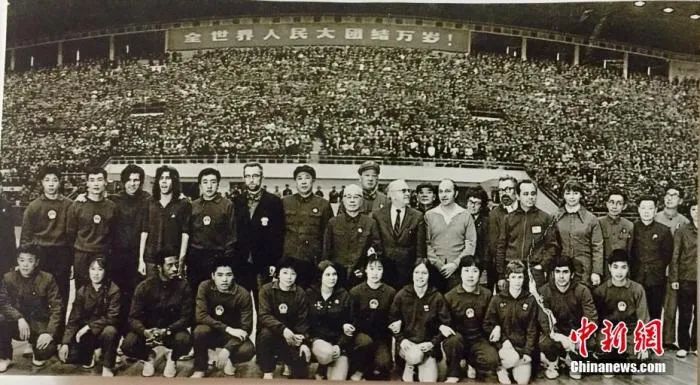 资料图:1971年美国乒乓球队与中方人员合照。中新社发