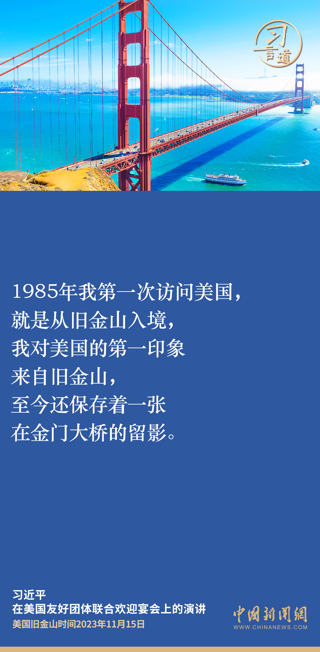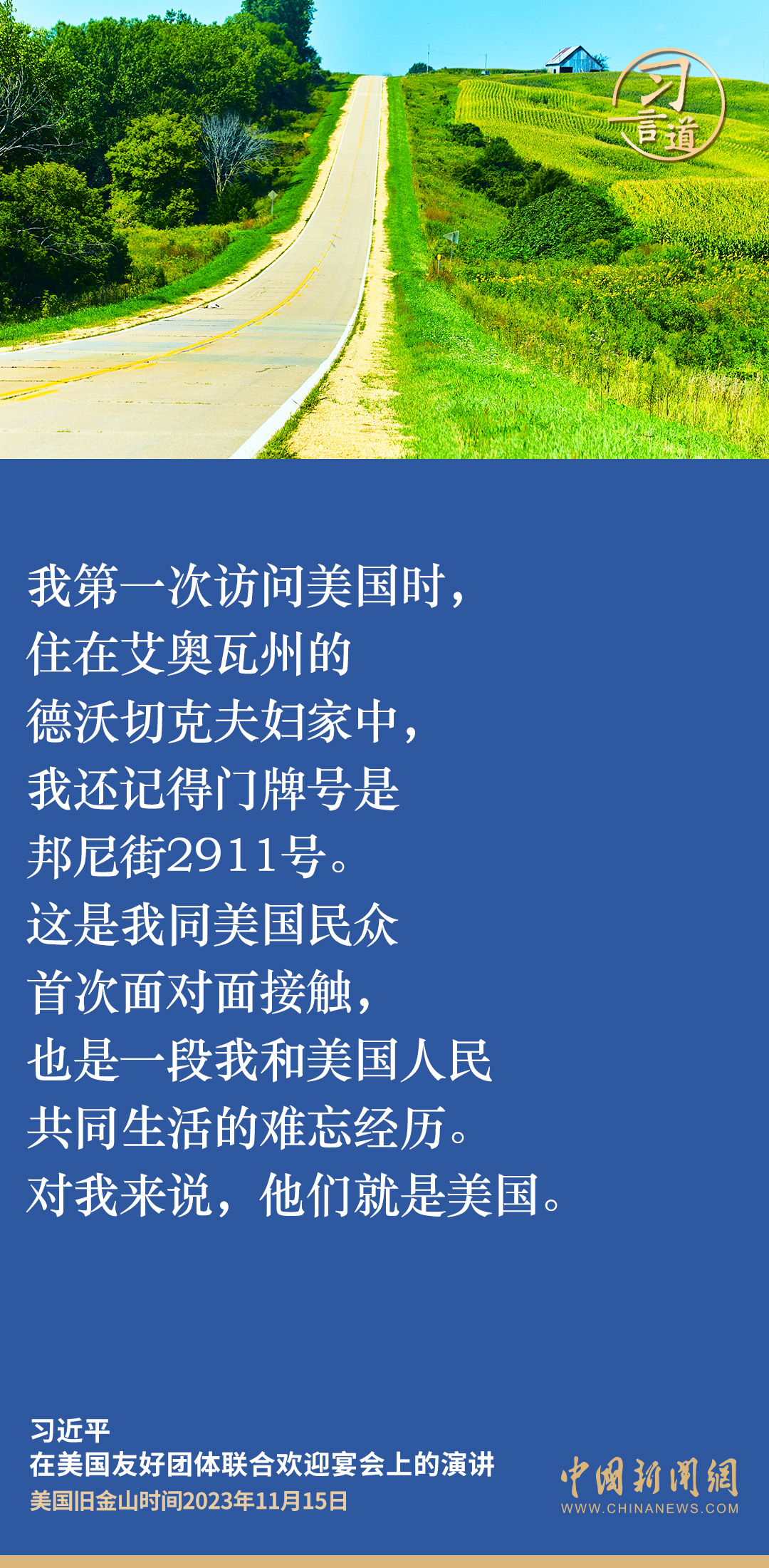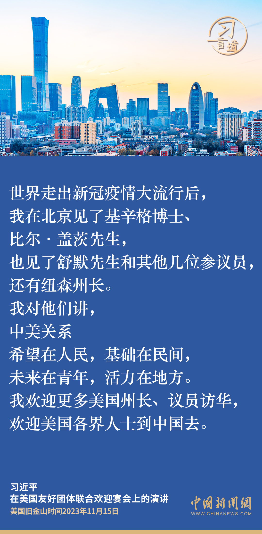 当地时间11月15日,中国国家主席习近平在美国旧金山出席美国友好团体联合欢迎宴会并发表演讲。演讲中,习近平频频以自身经历、感受、思考,与新朋旧友叙友情、话友好,畅谈中美相处之道。他谈到——