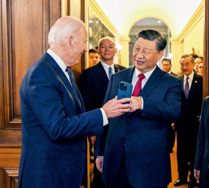 庄园宴会厅里,灯光璀璨,装饰典雅。当国家主席习近平走来时,在宴会厅门口迎候的美国总统拜登举起自己手机,指着一张照片笑问道。