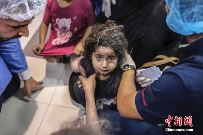 当地时间10月17日,加沙城,以色列炮击加沙城的Ahli Arab医院后,一名巴勒斯坦女孩在al-Shifa医院接受治疗。图/视觉中国