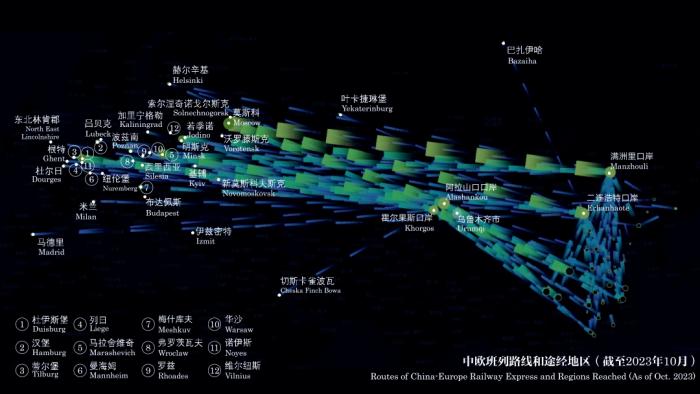 图8,中欧班列路线和途经地区(截至2023年10月)