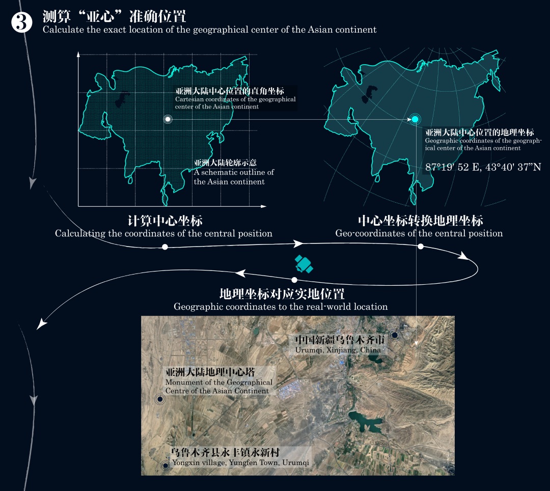 课题组将亚洲大陆图形中心坐标被转换为地理坐标,即为亚洲大陆地理中心;用地形图和卫星定位仪锚定该点的实地位置,即“亚心塔”重锤所指的地点(参考图4c)。