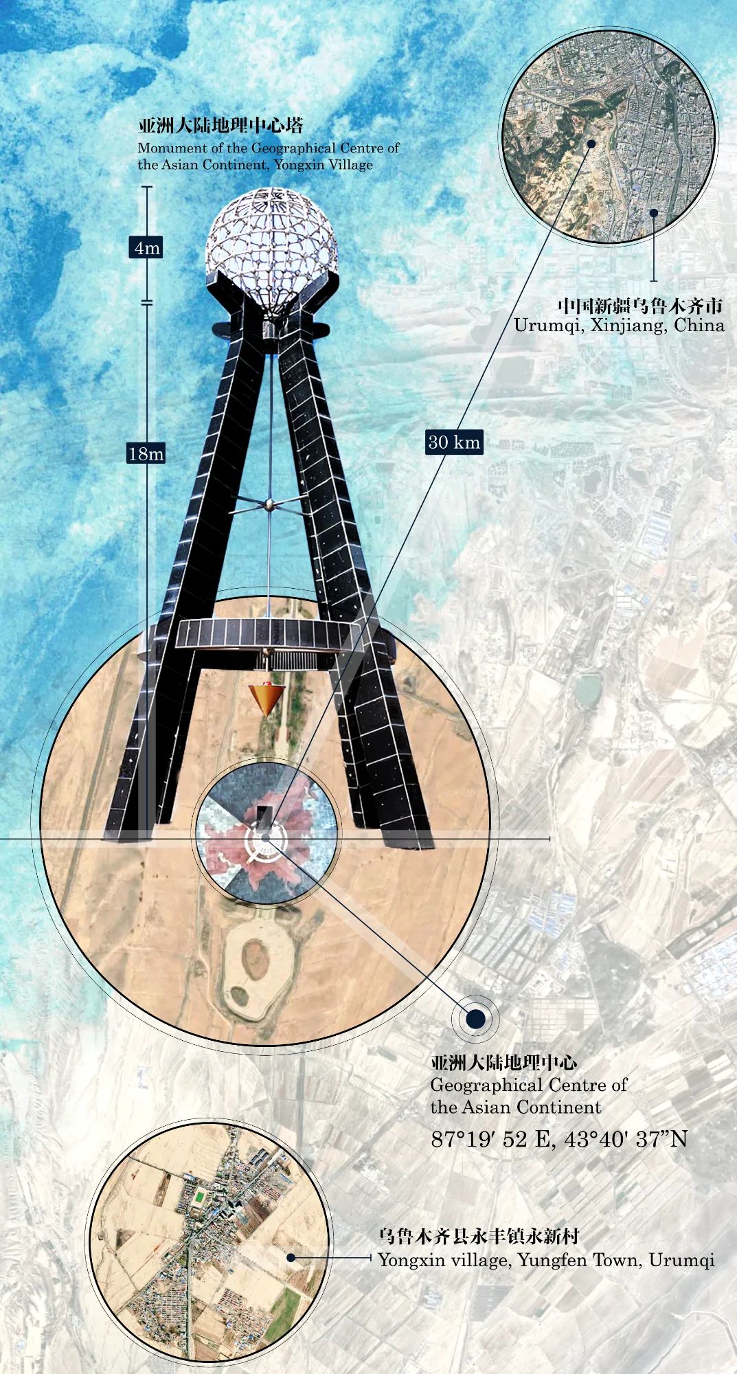 更具体的,“亚心”位于永新村“亚心”广场上的亚洲大陆地理中心塔(简称“‘亚心塔”)。这是一座钢筋混凝土铸造、花岗岩贴面的塔式建筑;总高22米,四根方形立柱托举着塔顶直径4米的网架钢球。球体下方悬挂重锤,直指塔基底部、亚洲微缩地图上“亚心”的精确地理坐标:东经87°19′ 52”、北纬43°40' 37”(参考图1)。
