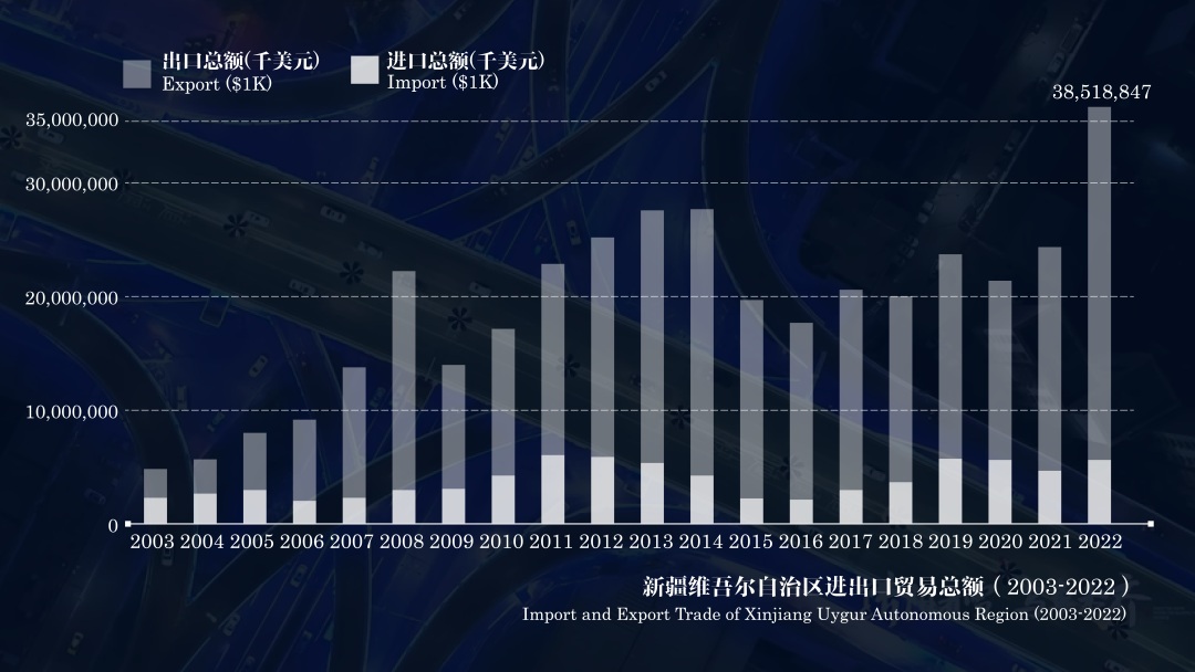 图9,2003-2022年新疆维吾尔自治区外贸进出口总值增长趋势(千美元)