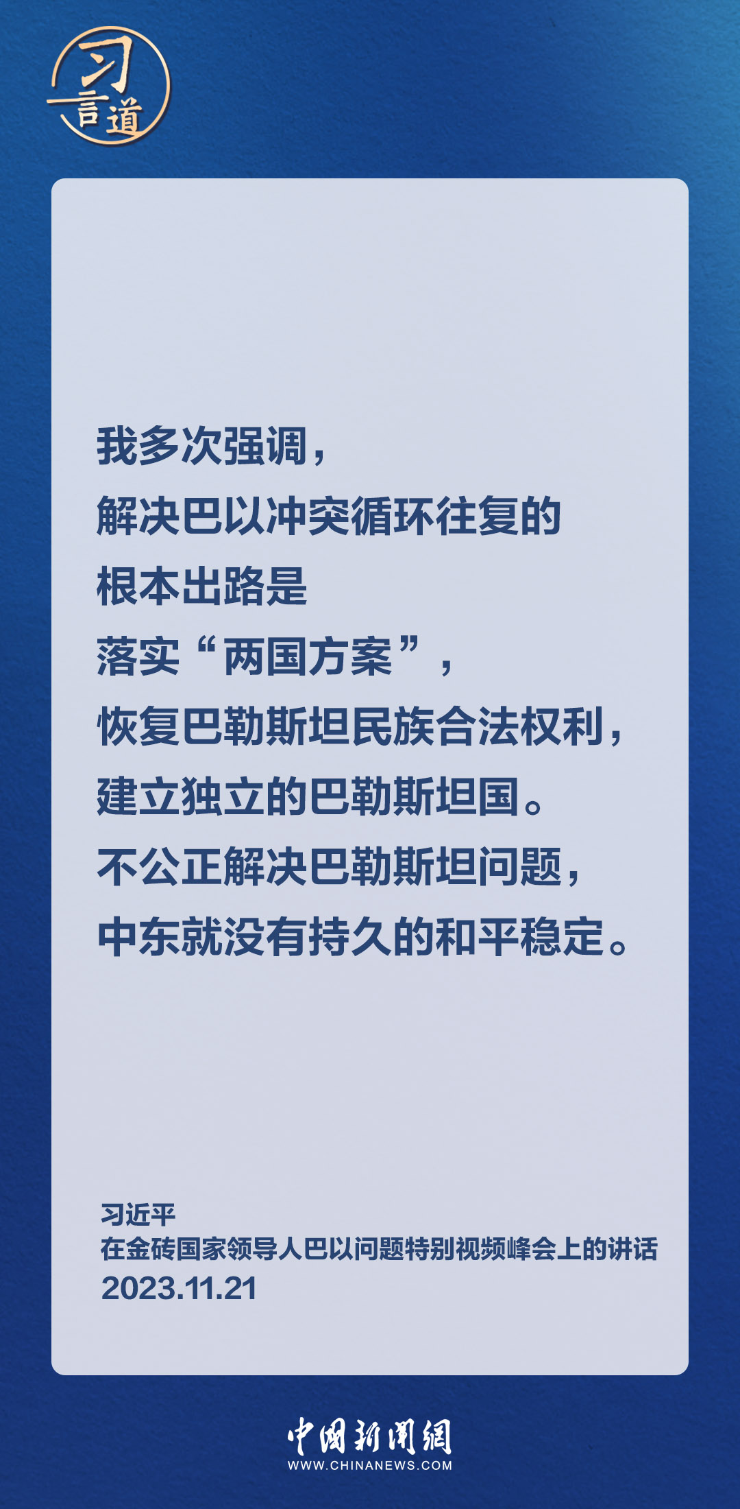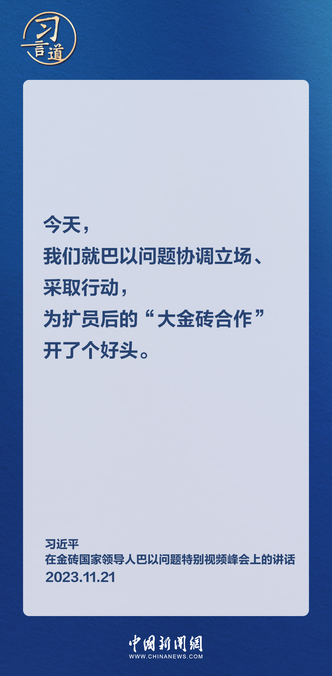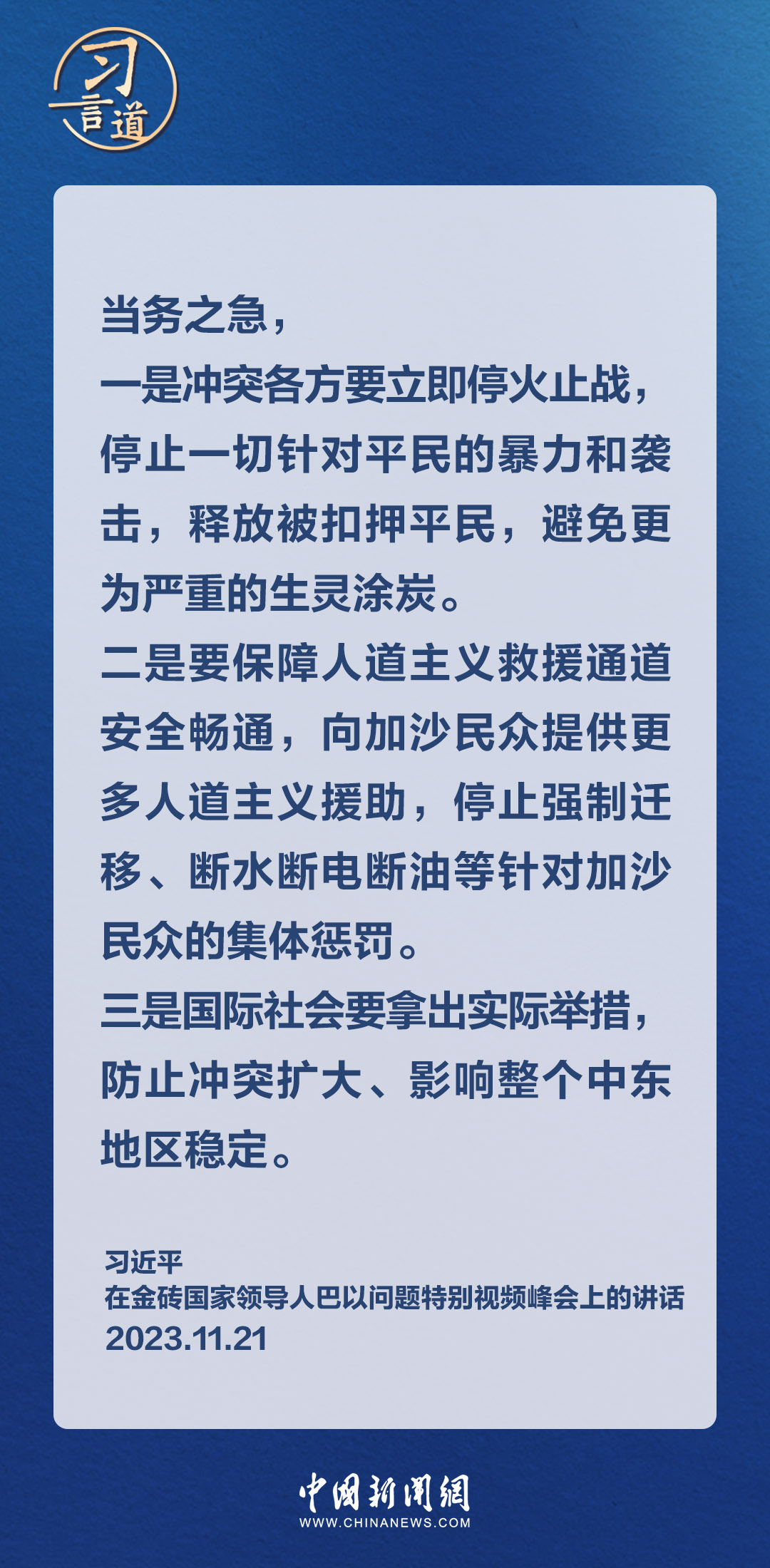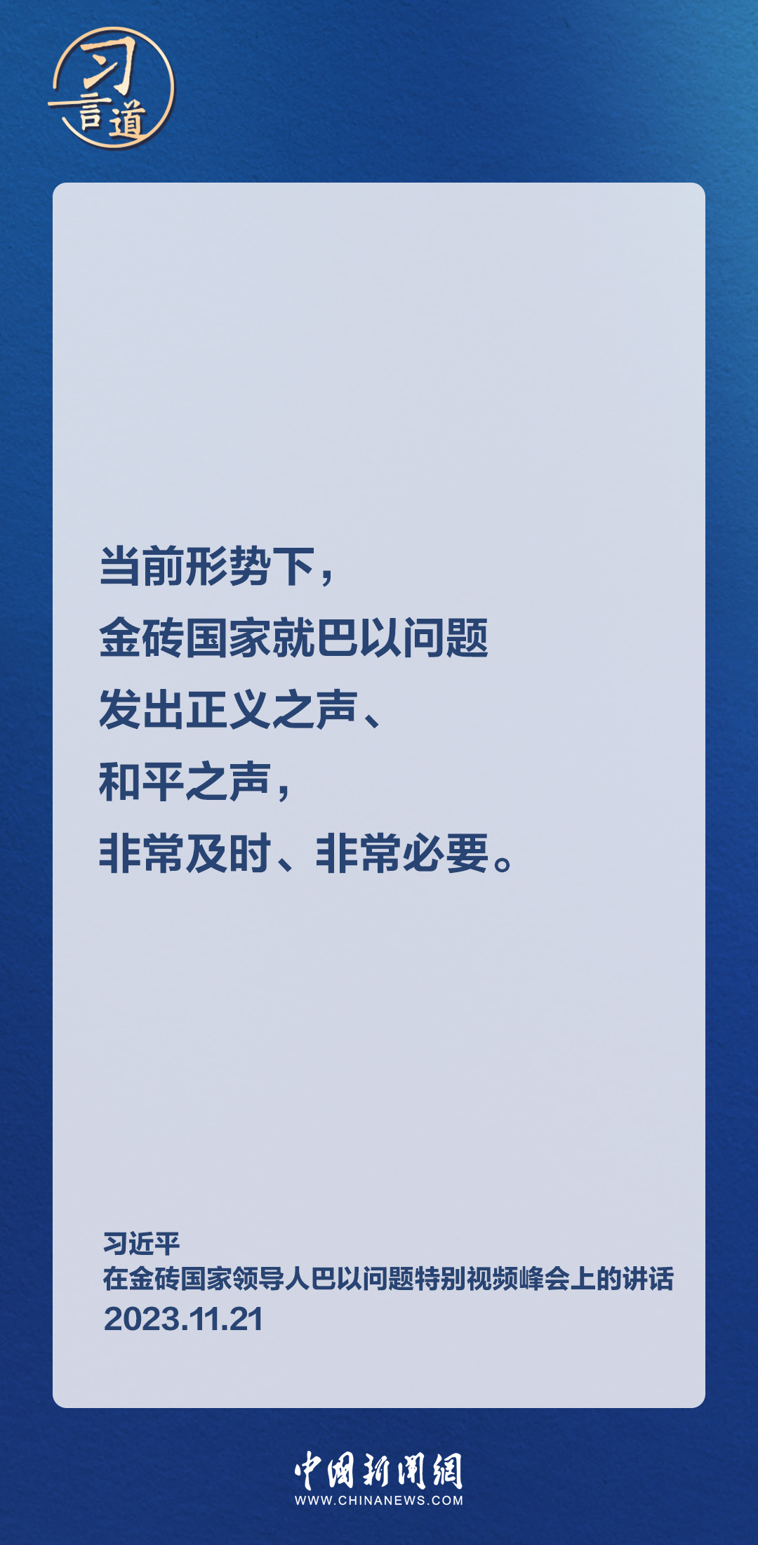 11月21日晚,国家主席习近平在北京出席金砖国家领导人巴以问题特别视频峰会。习近平指出——