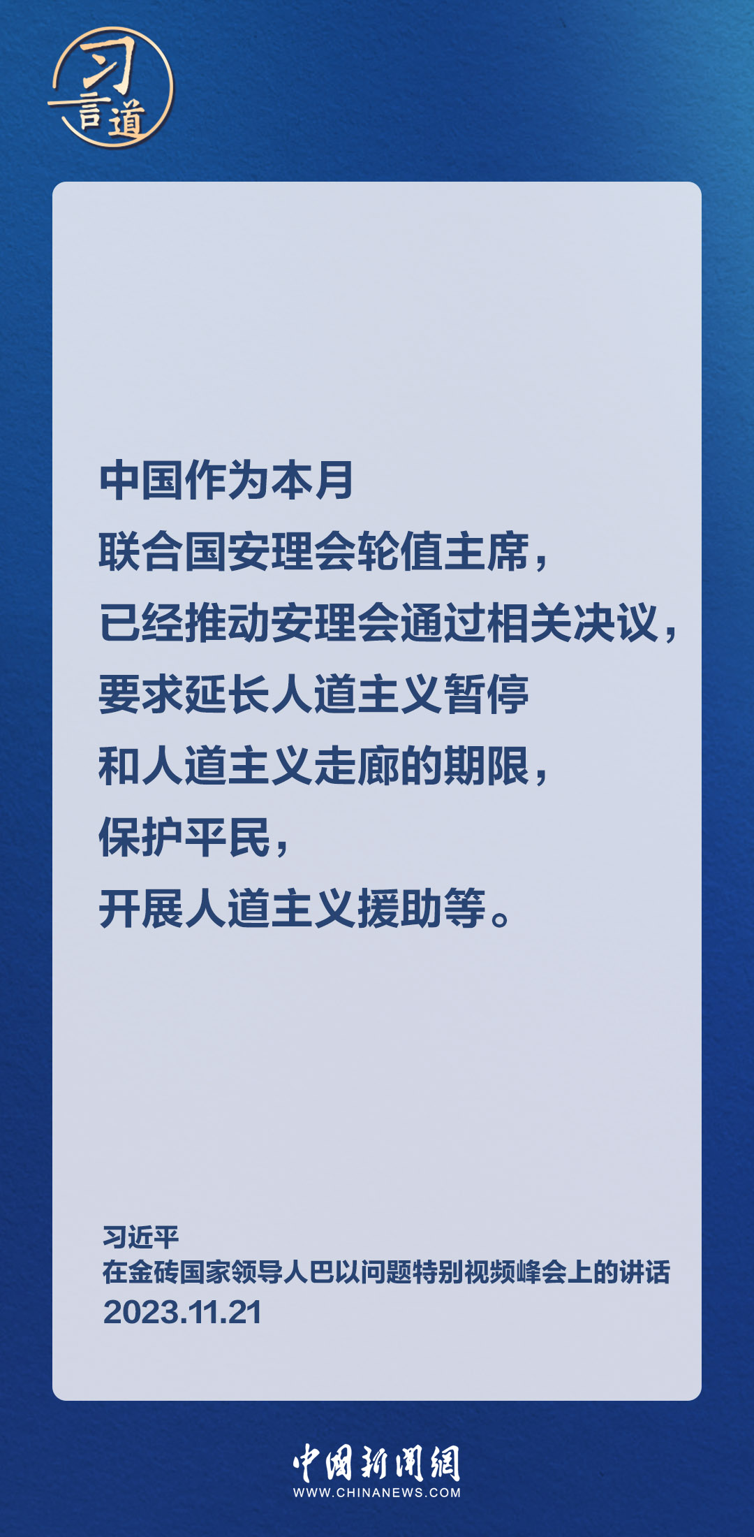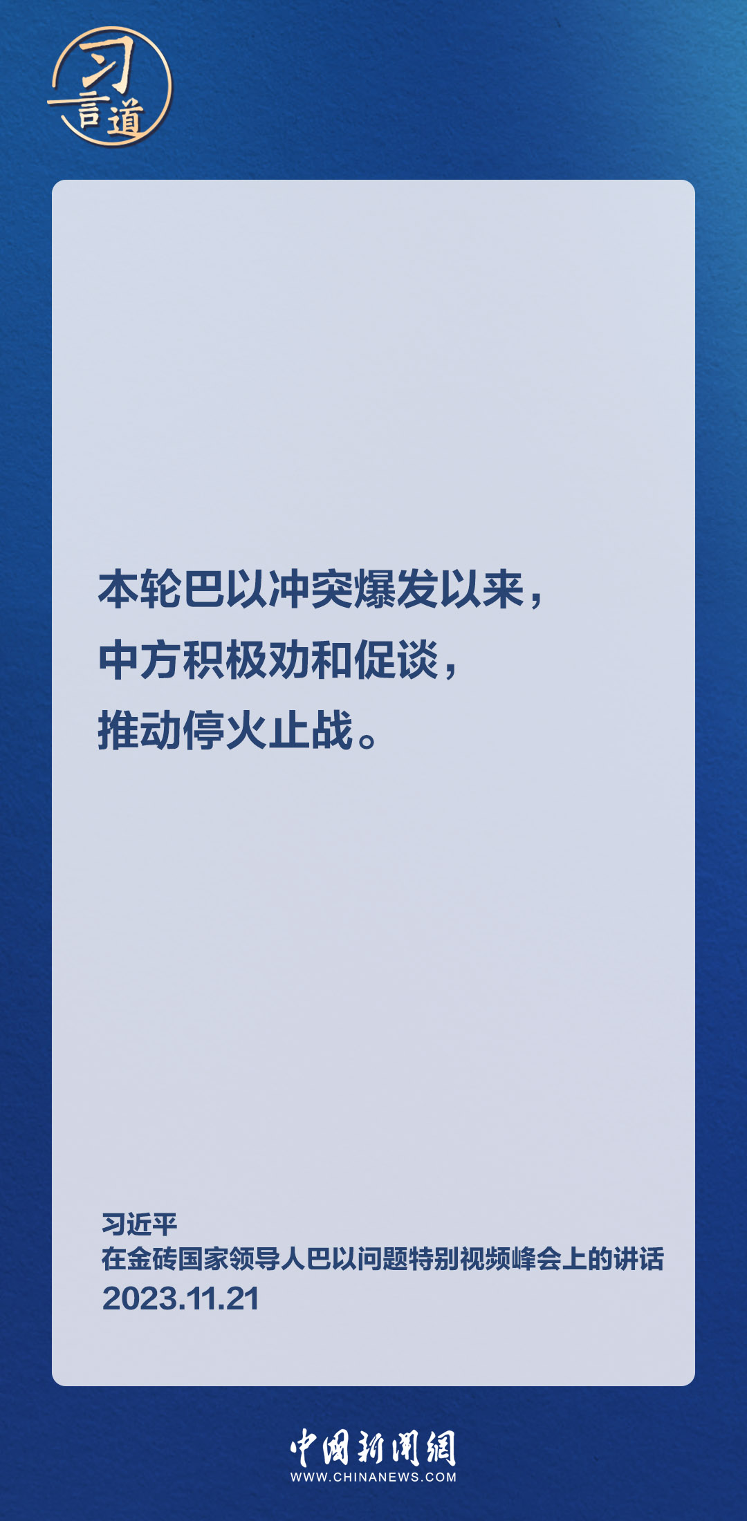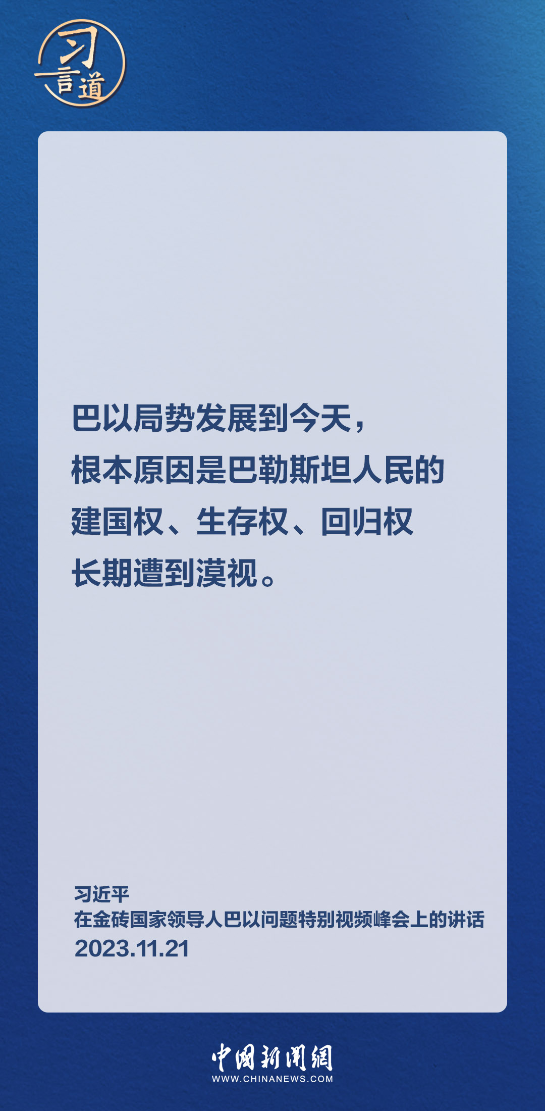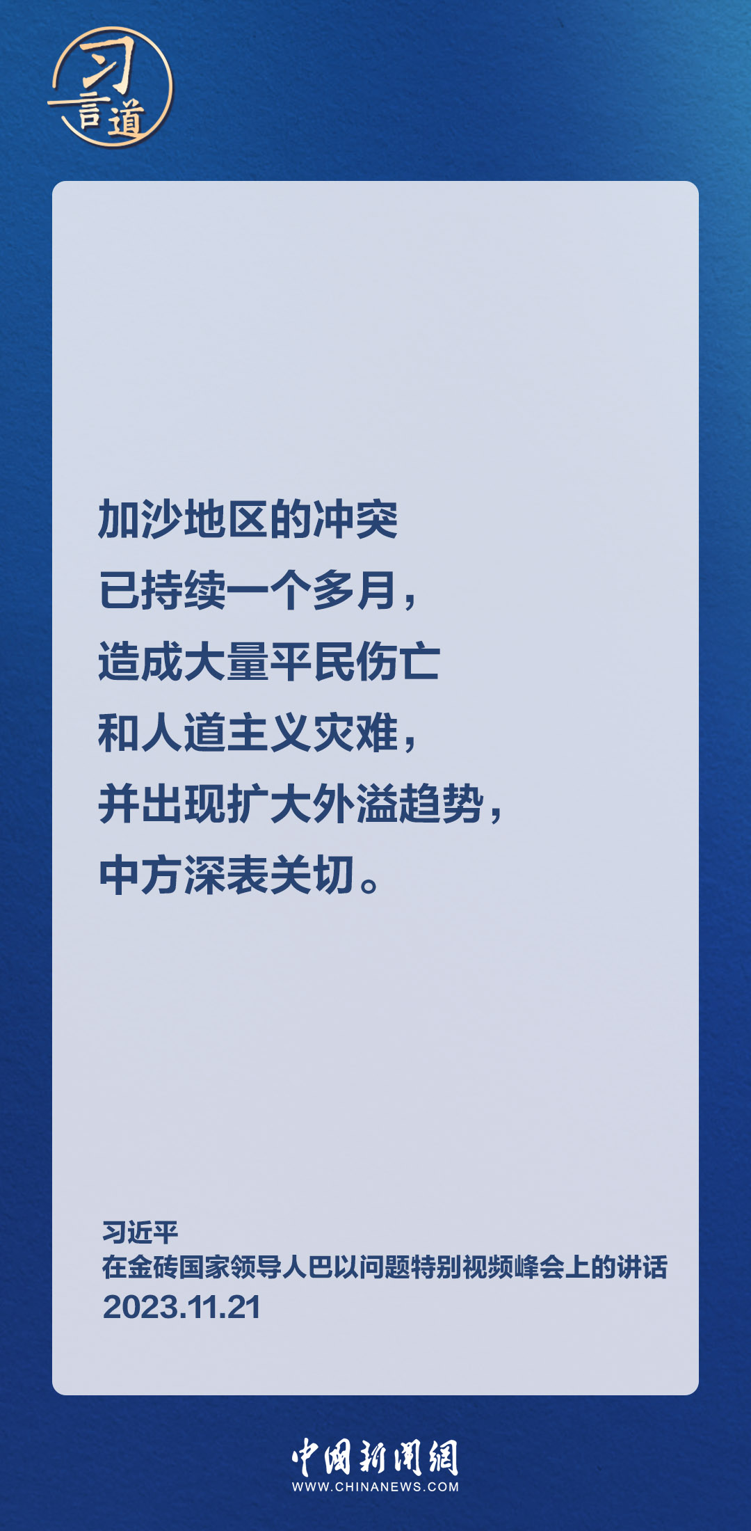 11月21日晚,国家主席习近平在北京出席金砖国家领导人巴以问题特别视频峰会。习近平指出——