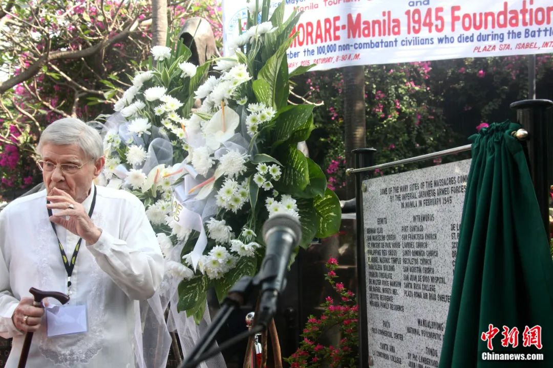 2015年2月14日,菲律宾“铭记马尼拉1945基金会”在马尼拉举办活动,纪念马尼拉战役70周年。图为与会人士揭开记载日军在马尼拉多处实施大屠杀地点的牌匾。张明 摄