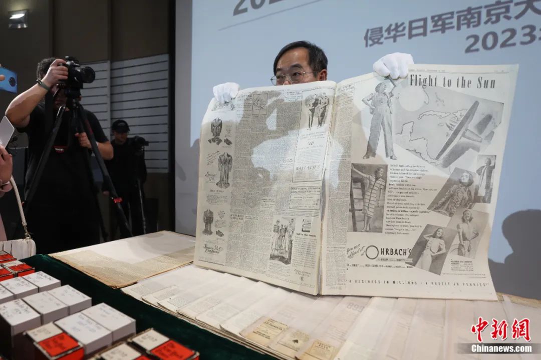 2023年12月8日,侵华日军南京大屠杀遇难同胞纪念馆举行2023年新征文物史料新闻发布会。美籍华人鲁照宁向媒体展示1937年12月6日出版的纽约时报,报纸对侵华日军进攻南京做了详细报道。泱波 摄