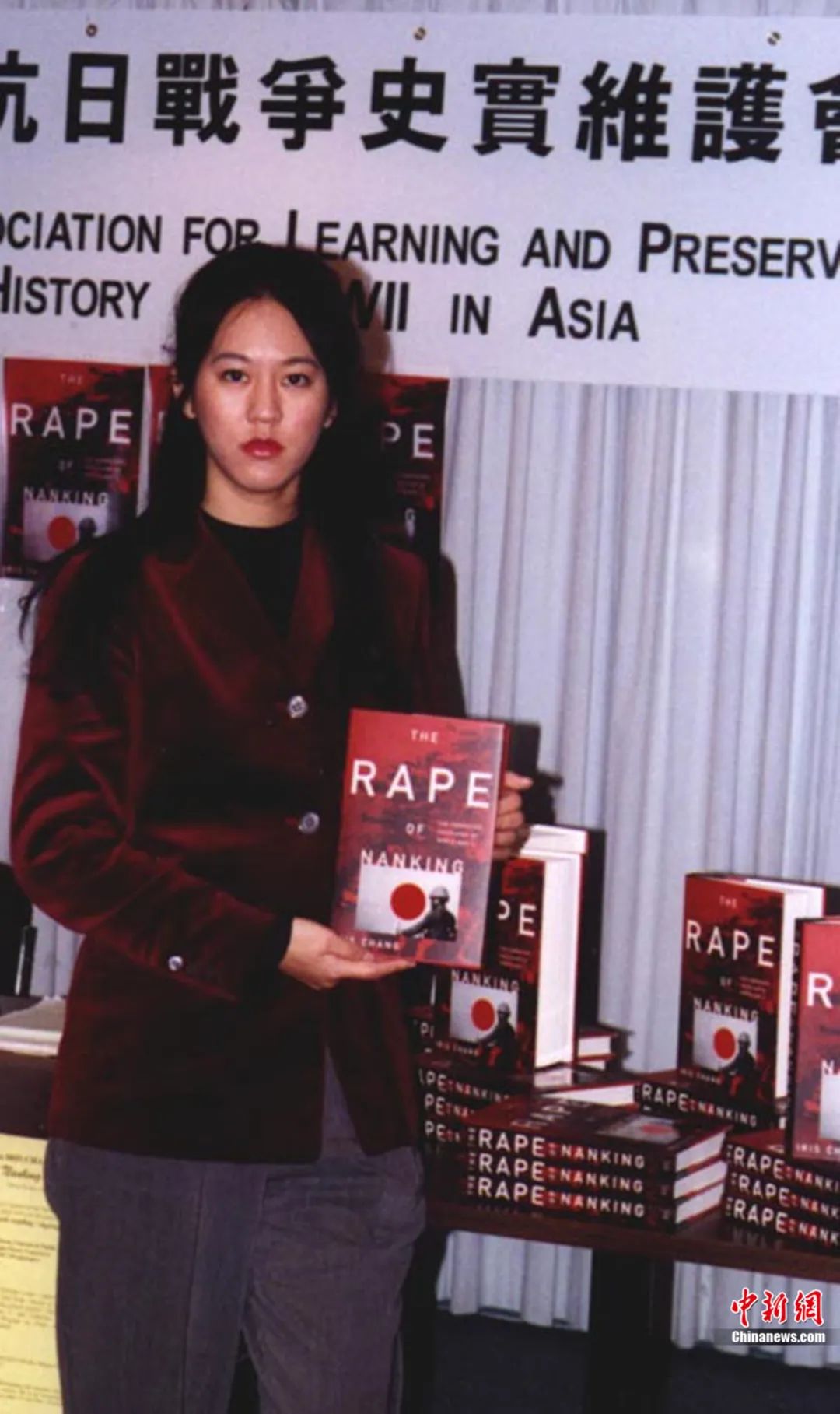 美国华裔作家张纯如与她的著作《南京暴行——被遗忘的大屠杀》。钟欣 摄