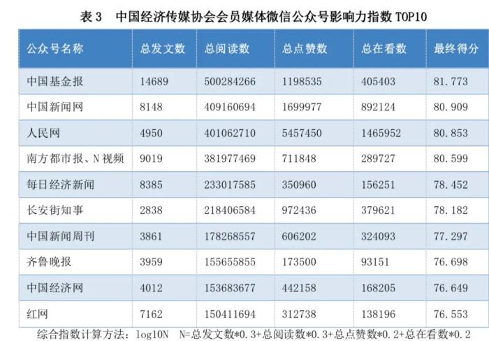 中国基金报、中国新闻网、人民网、南方都市报、每日经济新闻、长安街知事、中国新闻周刊、齐鲁晚报、中国经济网、红网10家媒体入选“中国经济传媒协会会员媒体微信公众号影响力指数TOP10”榜单。