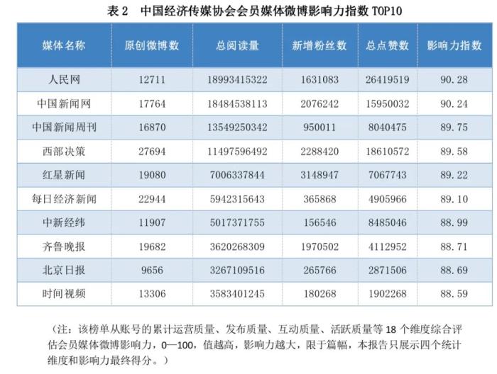 人民网、中国新闻网、中国新闻周刊、西部决策、红星新闻、每日经济新闻、中新经纬、齐鲁晚报、北京日报、时间视频10家媒体进入“2023 中国经济媒体微博影响力指数TOP10”榜单。