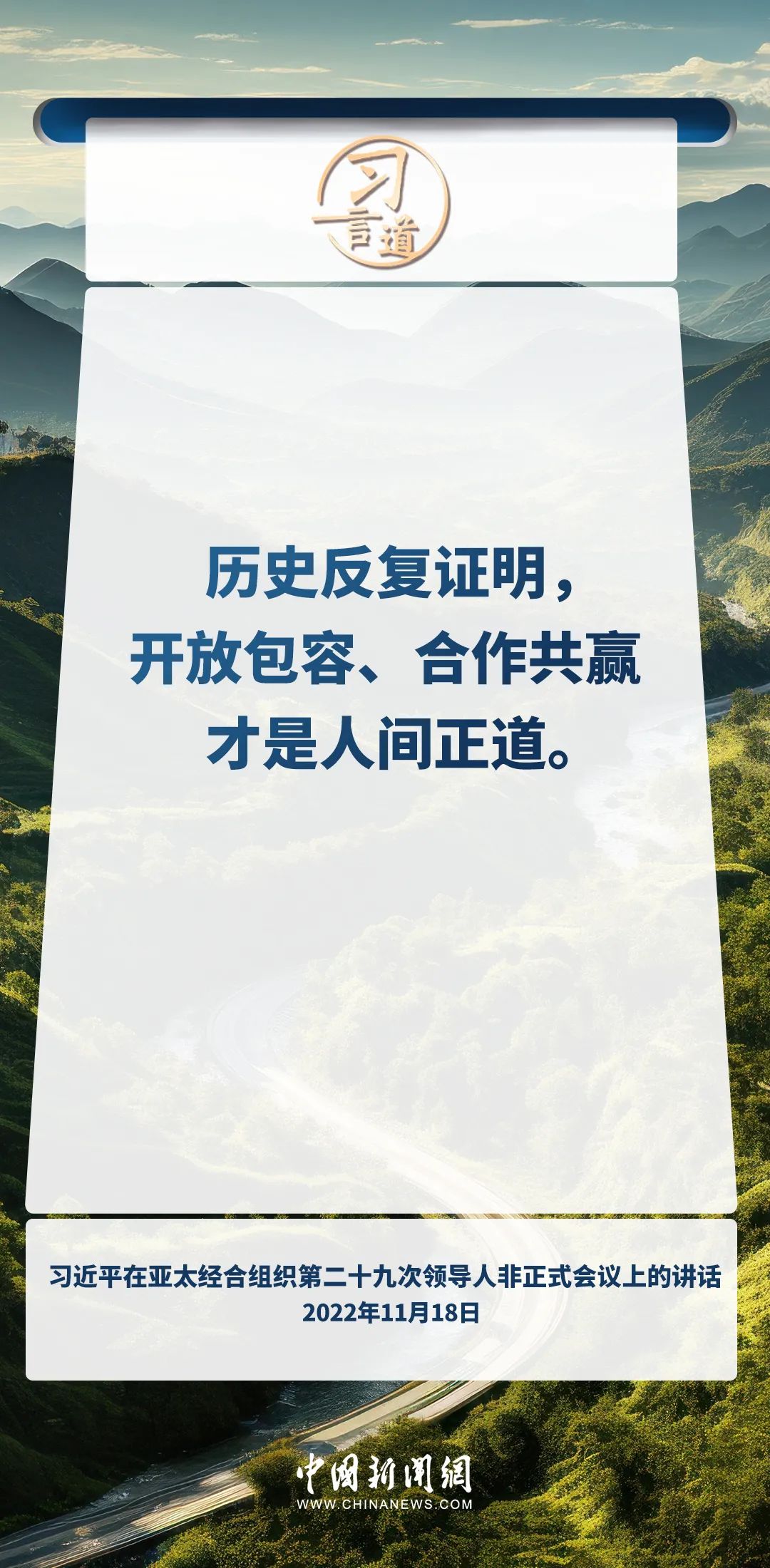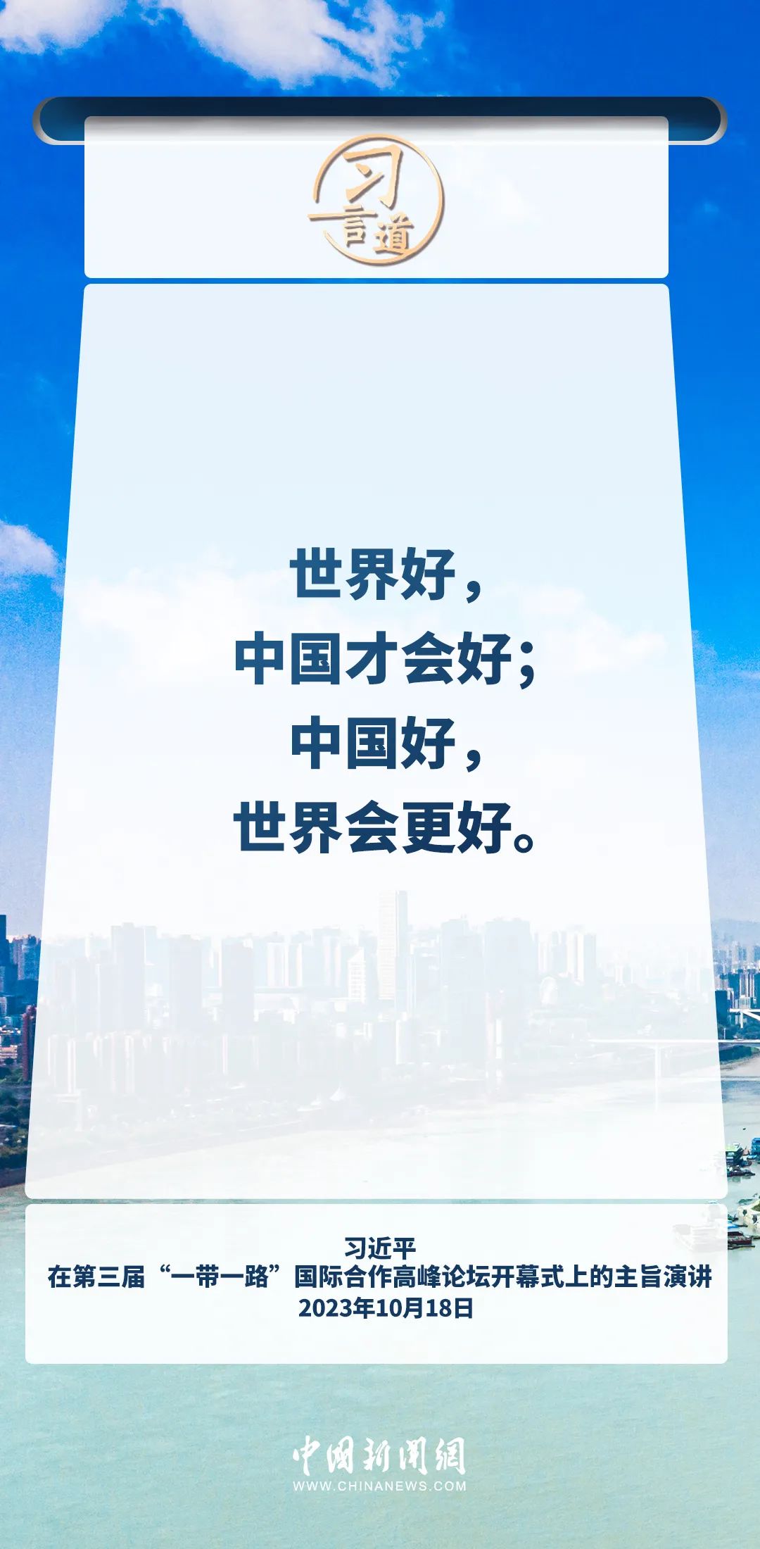 世界好,中国才会好;中国好,世界会更好。习近平主席在多个重要场合对人类命运共同体理念进行全面深刻论述,强调开放包容、合作共赢才是人间正道。