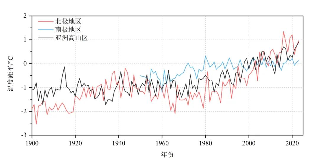 1900年至2023年南、北极地区和亚洲高山区表面平均温度距平(相对1991年至2020年平均值)(基础数据来源:中国气象局全球表面温度月值格点重建数据集V2.0)。来源:中国气象局微信公众号
