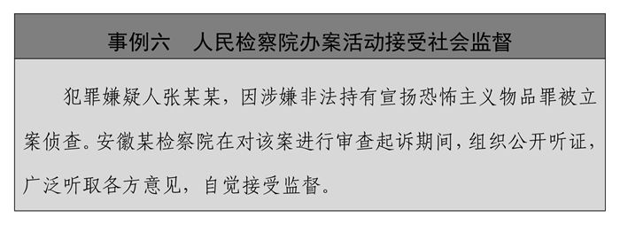 ——拓宽监督渠道。中国执法司法办案机关持续拓宽监督渠道,通过多种方式强化社会监督,不断增强执法司法透明度,防止执法权、司法权被滥用。人民法院通过审判流程信息公开、裁判文书公开、执行信息公开、庭审公开等加大司法公开力度,及时公布法院审判、执行工作情况。人民检察院推行检务公开,依法公开与检察职权相关的活动和事项,并充分运用现代化信息手段,建立检务公开信息平台,设置电子显示查询设备,开通网站、网页等,方便检务信息查询。公安机关推行警务活动公开,行政处罚遵循公开原则,执法过程、处罚结果自觉接受社会和公民的监督。司法行政机关推行狱务公开,将监狱执法工作的条件、程序、结果依法向社会公开,加强监狱工作的规范化、制度化、法治化建设,规范执法行为。