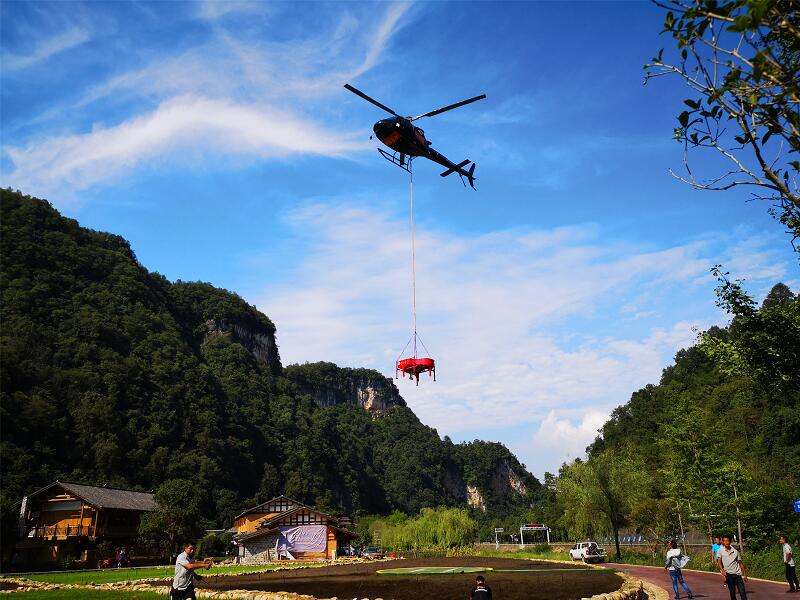 直升机飞越武陵源黄龙洞哈利路亚音乐厅的绿茵屋顶,这个屋顶将是2018黄龙音乐季的开幕式主会场。