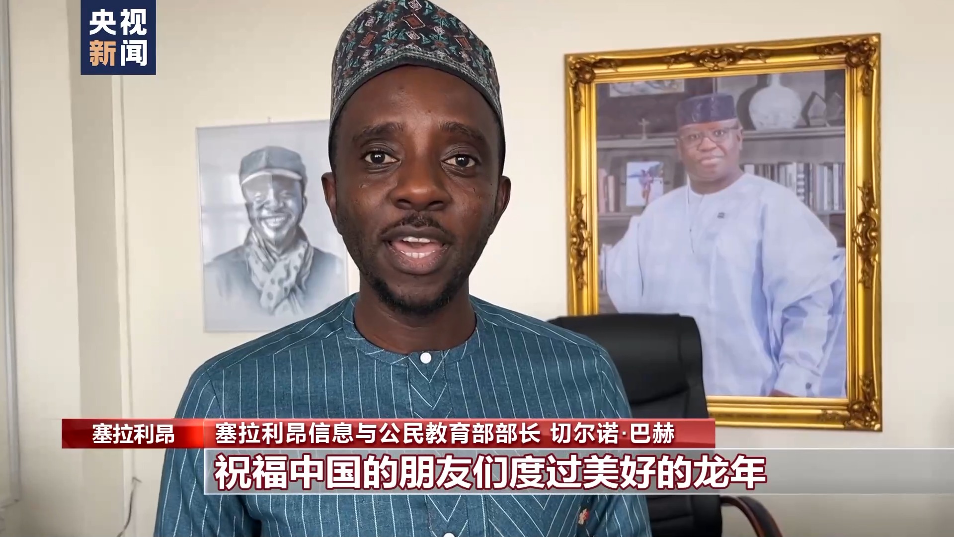 塞拉利昂信息与公民教育部部长 切尔诺·巴赫:祝福中国的朋友们度过美好的龙年,我在塞拉利昂祝你们万事如意。