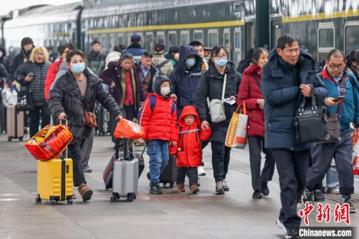 2024年2月6日,江苏南京铁路春运客流保持高位运行,携带行李的旅客在火车站出行。泱波 摄