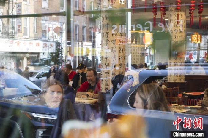 2023年1月28日,美国纽约曼哈顿唐人街一家中餐厅食客满座,纽约客在各大知名中餐厅外排队候餐等待品尝中国“年味”。廖攀 摄