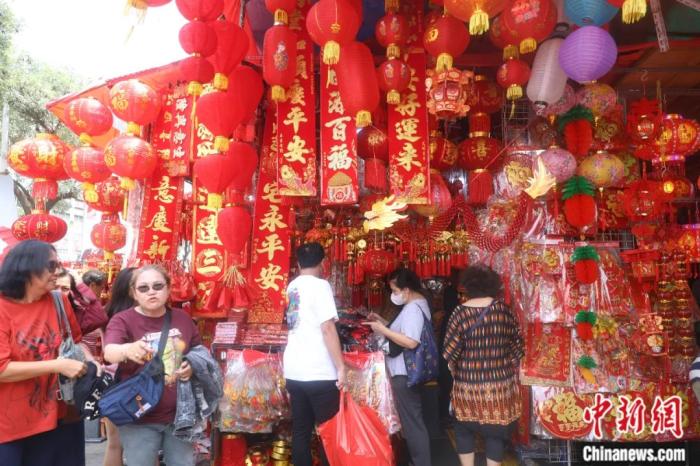 2024年2月5日,印度尼西亚首都雅加达北区班芝兰的唐人街上,摆满了灯笼、春联、红包、中国结,吸引民众购买。李志全 摄