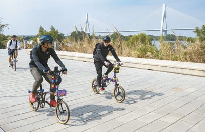 几名自行车运动爱好者在横琴芒洲湿地公园骑行锻炼。该公园位于横琴粤澳深度合作区西北角,吸引了珠海和澳门等地的众多游客前来休闲游玩。