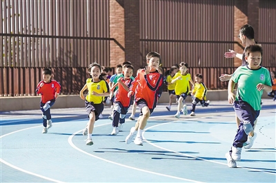 深圳前海哈罗港人子弟学校,学生们在操场上运动。该学校便利了香港学生就学,有力支持前海打造优质教育环境。