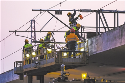 春节假期,国铁武汉局襄阳供电段职工在襄阳火车站清洗相关设备。