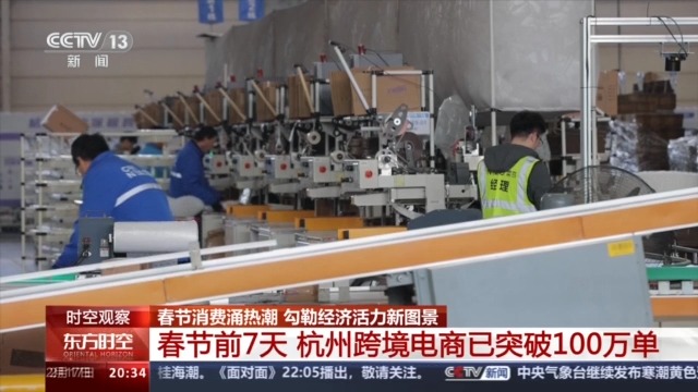 春节期间,在杭州跨境电商综试区,一排排货架上整齐码放着来自世界各地的“特产”,工作人员正在分拣、打包,一派繁忙景象。