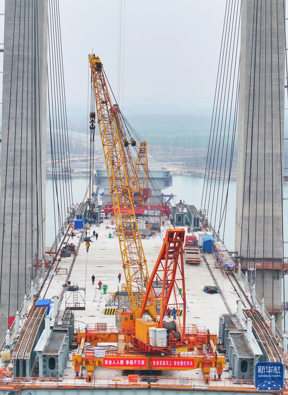 2月18日,在湖北襄阳牛首汉江特大桥施工现场,施工人员进行吊装作业。