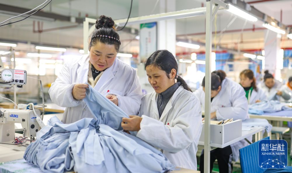 2月18日,贵州省铜仁市玉屏侗族自治县一家服装生产企业,工人加工出口订单服装。