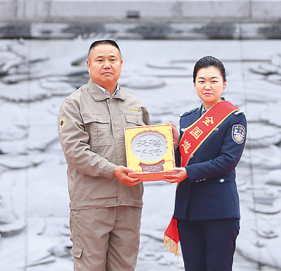 第八届全国道德模范何巧(右)为敬业奉献“中国好人”代表彭柳升(左)赠送道德传家宝。