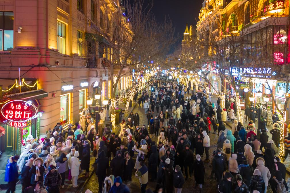 2024年1月9日,游客在哈尔滨百年老街中央大街上游玩(无人机照片)。新华社记者 张涛 摄