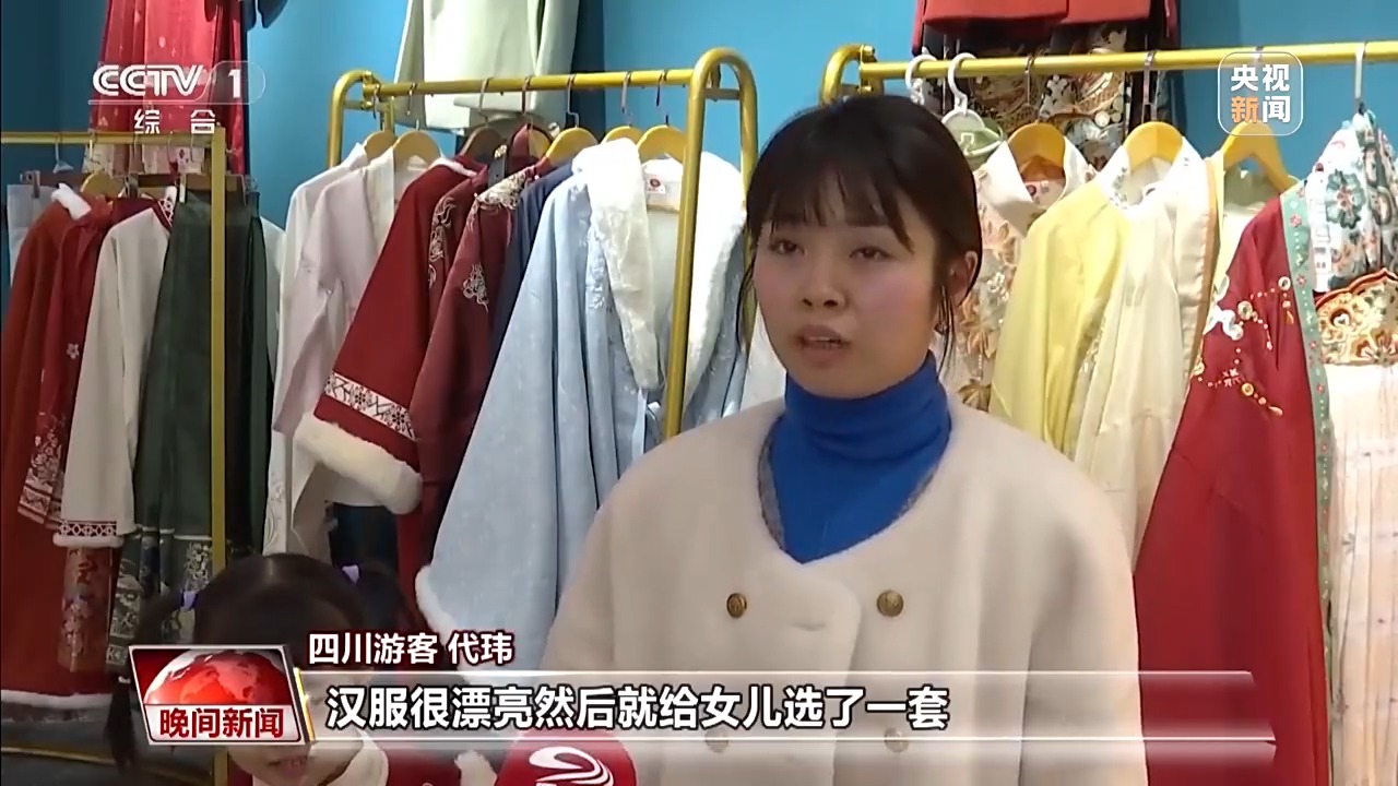 四川游客 代玮:汉服很漂亮,然后就给女儿选了一套,小朋友也很喜欢。