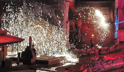 大年初七,晚上7点,山西省晋城市司徒小镇的山水实景剧《千年铁魂》准时开演。当台上的几位工匠将金黄色的铁水一齐抛洒向天空,绚烂的铁花在空中绽放,气势磅礴。观众的情绪也在此刻到达顶峰。