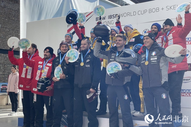 2023年11月17日—19日,2023—2024赛季国际雪车联合会雪车和钢架雪车世界杯延庆站比赛在位于北京延庆的国家雪车雪橇中心举行,图为颁奖仪式。人民网记者 尹星云摄