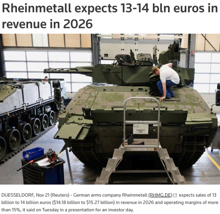 △路透社:德国最大的军备制造集团——莱茵金属公司预计其营收额到2026年将比2023年翻一番,达到130亿至140亿欧元;营业利润率将升至15%以上。