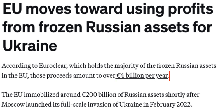 意识到直接没收资产风险太大后,欧洲退而求其次,打起了俄被冻结资产所产生金融收益的主意。