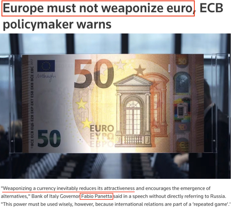 作为欧洲央行一位颇有影响力的决策者,意大利央行行长帕内塔警告称,欧元区不应在全球冲突中把自己的货币用作武器,因为这最终会削弱欧元本身。