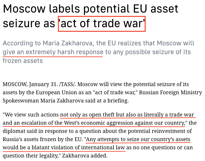 “我们认为此类行为不仅仅是一般的盗窃,而是一种真正的贸易战,是西方对我国经济侵略的升级。任何没收我国资产的企图都严重违反国际法。”
