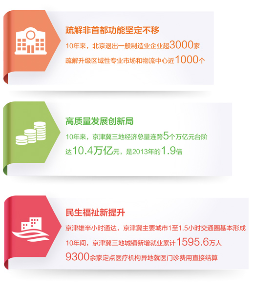 10年来,京津冀协同发展取得丰硕成果,交通、生态、产业、公共服务等重点领域持续突破,形成了目标同向、措施一体、优势互补、互利共赢的发展格局。