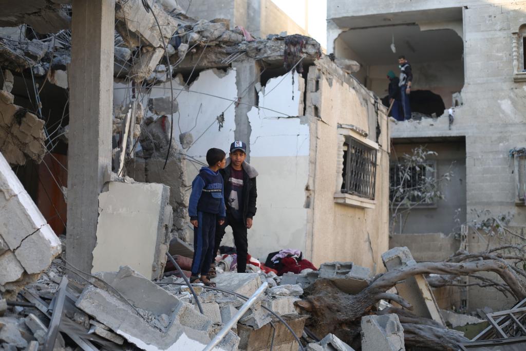 2月21日,在加沙地带南部城市拉法,巴勒斯坦人查看以军空袭后的废墟。新华社发(哈立德·奥马尔摄)