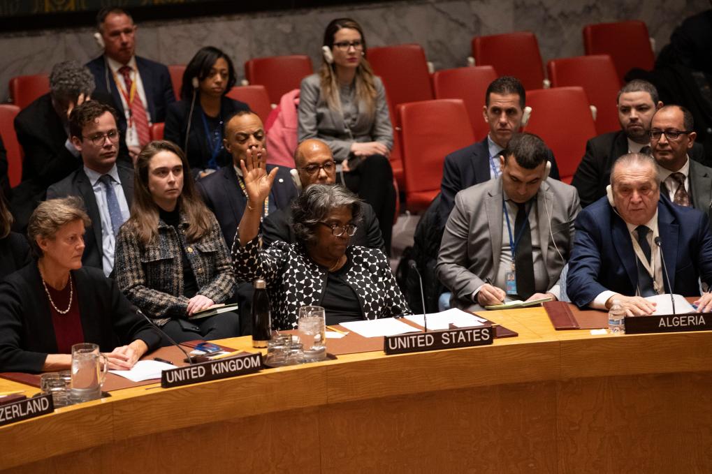 2月20日,在位于纽约的联合国总部,美国常驻联合国代表琳达·托马斯-格林菲尔德(前中)在安理会就决议草案进行表决时投反对票。新华社记者 谢锷 摄
