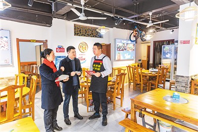 在重庆市云阳县青龙街道,中国建设银行云阳支行普惠信贷员来到辖区内一家餐馆,为商户(右)介绍普惠金融政策。