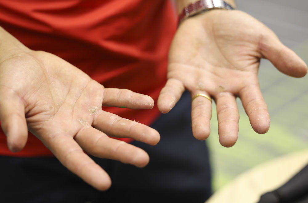 ↑大量的训练和比赛在吐尔松江·布尔力克的手上留下老茧(2023年11月17日摄)。