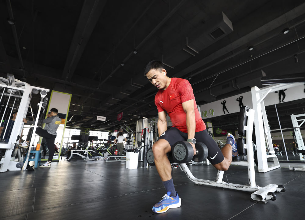 ↑2023年11月17日,吐尔松江·布尔力克在乌鲁木齐的一家健身房锻炼,备战第十四届全国冬季运动会。